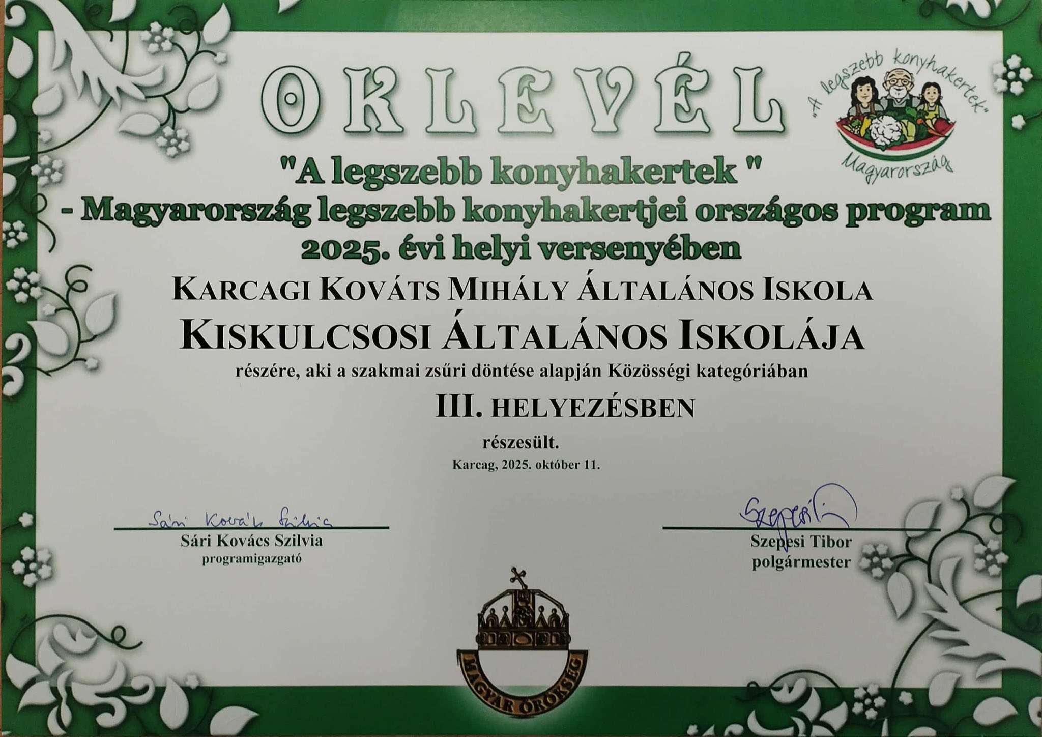 „ A legszebb konyhakertek”-Magyarország legszebb konyhakertjei országos program 2025. évi helyi versenyében közöségi kategóriában a Karcagi Kováts Mihály Általános Iskola Kiskulcsosi Általános Iskola kertje III. helyezésben részesült.