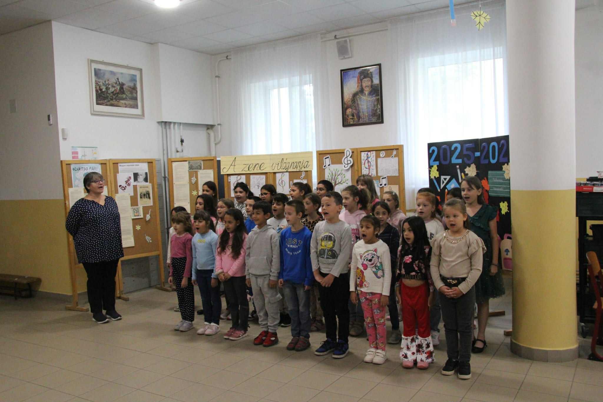 A zene világnapja 2025. október elsején 9 órakor iskolánk alsó tagozata az aulában emlékezett meg a zene világnapjáról. Patkóné Erdei Judit tanárnő beszélt a zene szeretetéről, jelentőségéről, hatásairól életünkben. az alsós énekkar elénekelt 3 népdalt, majd jó hangulatú közös éneklésre került sor.